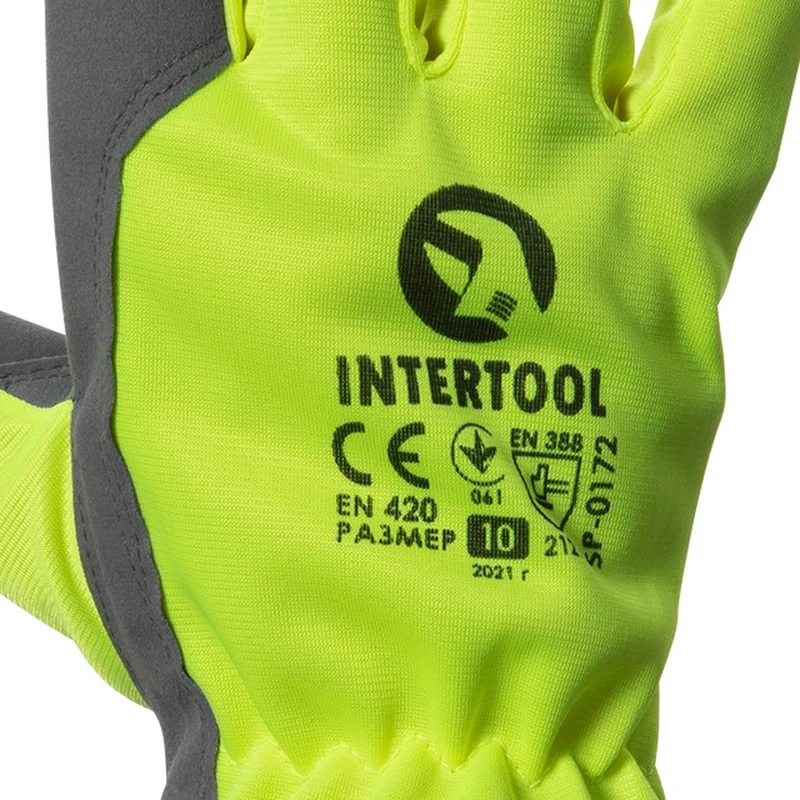 Захисні рукавички INTERTOOL SP-0172 виготовлені з високоякісної козячої шкіри зі вставками із зеленої (помаранчевої) флуоресцентної тканини на тильній стороні долоні. Застосовуються працівниками дорожніх служб, прибиральниками, водіями, що працюють в умовах поганої видимості, а також при виконанні інших робіт в темний час доби. Зап'ястя рукавички зібрано вшитою резинкою, що забезпечує щільне прилягання та захищає від потрапляння всередину дрібного сміття.