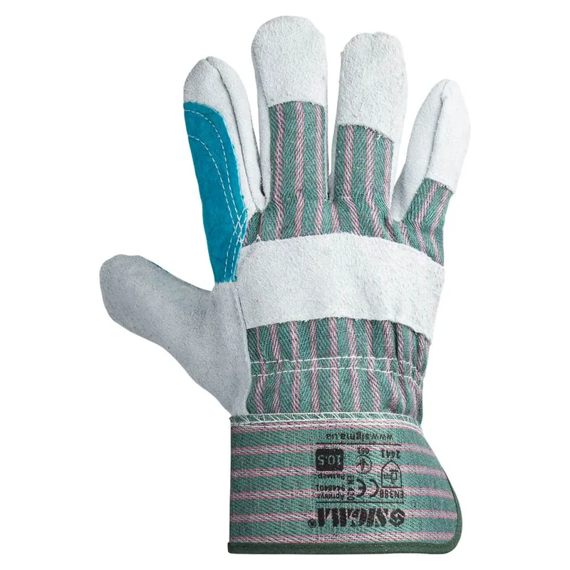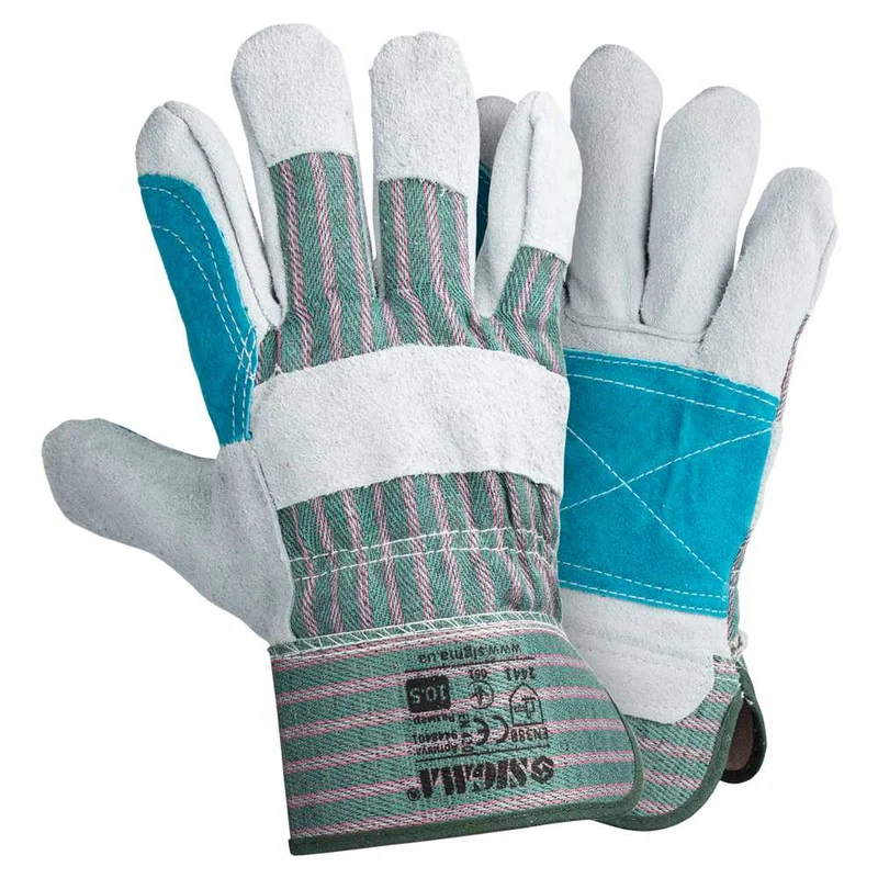 Рукавички комбіновані замшеві р10,5, клас ВС (посилена долоню) Sigma (9448401) призначені для захисту рук від механічних впливів при проведенні важких робіт. Відмінні характеристики: робоча поверхня долоні, великого і вказівного пальців посилена високоякісним спилком.