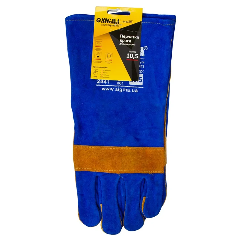 Рукавички краги зварника р10,5, клас А, довжина 35см (синьо-жовті) Sigma (9449321) призначені для захисту рук при проведенні зварювальних робіт, захисту від механічних і термічних впливів.