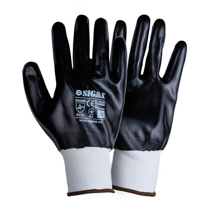 Рукавички трикотажні з повним нітриловим покриттям р10 (чорні манжет) SIGMA (9443561) призначені для захисту від механічних впливів, жиру і масла. Оптимально підходять для робіт, де необхідна висока точність. Завдяки довговічності нітрилового покриття особливої популярності рукавички придбали на СТО, шиномонтажних майстерень.