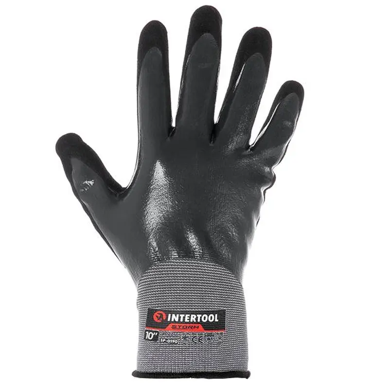 Рукавички трикотажні синтетичні, повне двошарове нітрилове покриття, базове гладке, пористе на долоні, дихаючі, 10" STORM INTERTOOL SP-0190