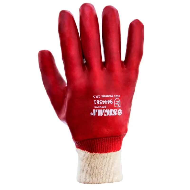 Рукавички трикотажні з ПВХ покриттям (червоні манжет) Sigma (9444361) призначені для захисту рук від впливів масел, жирів, нафтопродуктів, а також механічних впливів.