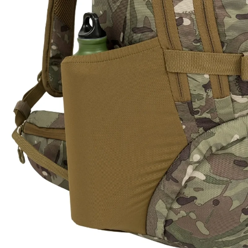 - Кроме основного отделения, двух боковых эластичных карманов и кармана сверху, этот рюкзак имеет систему креплений MOLLE для фиксации снаряжения, а также совместим с питьевой системой (гидратором).