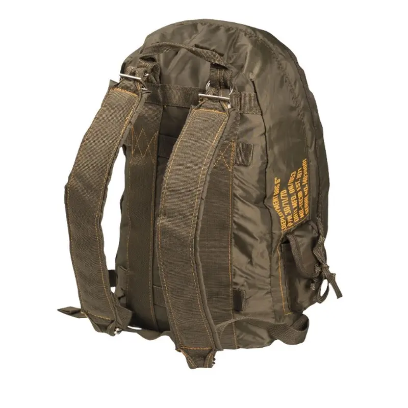 Рюкзак оборудован одним основным отделением с внутренним карманом, закрывающимся на двустороннюю молнию, и четырьмя внешними карманами. Один из внешних карманов имитирует картридж AAD (Automatic Activation Device). Выделенные швы, массивный карабин, многочисленные принты и система ношения, похожая на парашютную подвеску, придают рюкзаку характер чехла для парашюта.
