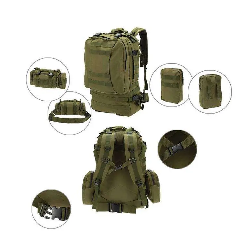 Рюкзак с подсумками черный на 55л Рюкзак с подсумками черный на 55л - универсальная и очень популярная модель за счет своей функциональности. Благодаря навесным подсумкам рюкзак можно трансформировать под необходимые задачи и количество переносимых вещей. Рюкзак выполнен из высококачественных материалов. На внешней и боковых сторонах нашиты MOLLE-стропы для навески дополнительных подсумков или снаряжения. Имеет множество внутренних и внешних карманов на застёжках, мягкую спинку с вентиляционными ходами, компрессионные стяжки, а также мягкие плечевые ремни. С помощью регулируемых ремней можно легко подогнать рюкзак под себя. Съемные боковые сумки и сумка на поясе могут использоваться отдельно. Сумка в отдельном виде имеет свой собственный ремень через плечо или на пояс. Характеристики: Страна производитель: Китай; Объем: 55 л; Качественный пошив и фурнитура; Материал: Оксфорд 600D; Вес: 1.5 кг; Длина: 22 см; Ширина: 35 см; Высота: 53 см; Цвет: Черный (как на 1й фотографии, остальные фото представлены исключительно для дополнительной демонстрации модели); 8 отсеков на молнии; Регулируемые ремни: плечевой, грудной клетки и пояса; Основное отделение с внутренним карманом; Переднее отделение с внутренним карманом; 2 съёмных боковых сумки с внутренними карманами; Мягкая анатомическая зона спины; Мягкие эргономичные плечевые лямки с D-кольцами регулируются по длине; Регулируемый нагрудный ремень; Стропы МOLLE для дополнительной экипировки.