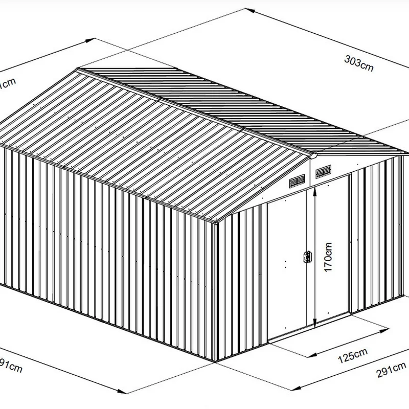 - Великі розміри: розміри 303 x 301 x 214 см забезпечують достатньо місця для зберігання садового інструменту та аксесуарів.