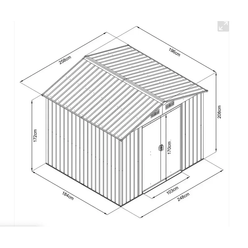 - Великі розміри: розмір 196 x 258 x 208 см надає достатньо місця для зберігання садового інструменту та обладнання.
