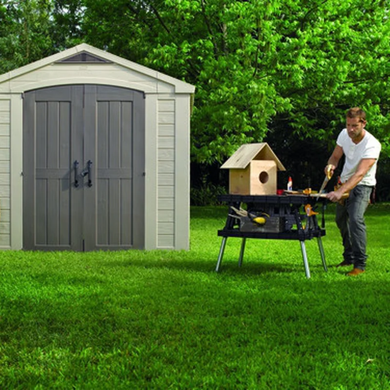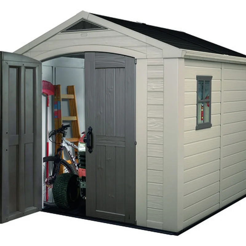 Чудовим рішенням для тих, хто шукає стильний і функціональний садовий будиночок, є FACTOR 8x8. Дуже містке приміщення з двосхилим дахом і двопільними широкими дверима прекрасно підійде для зберігання великого габаритного обладнання, такого як газонокосарки, сходи, велосипеди та набори для гриля. Завдяки можливості установки полиць і вішалок простір усередині будиночка можна оптимально практично систематизувати та організувати. Виріб не вимагає сервісного обслуговування, не іржавіє, не гниє, а його покриття не лущиться.