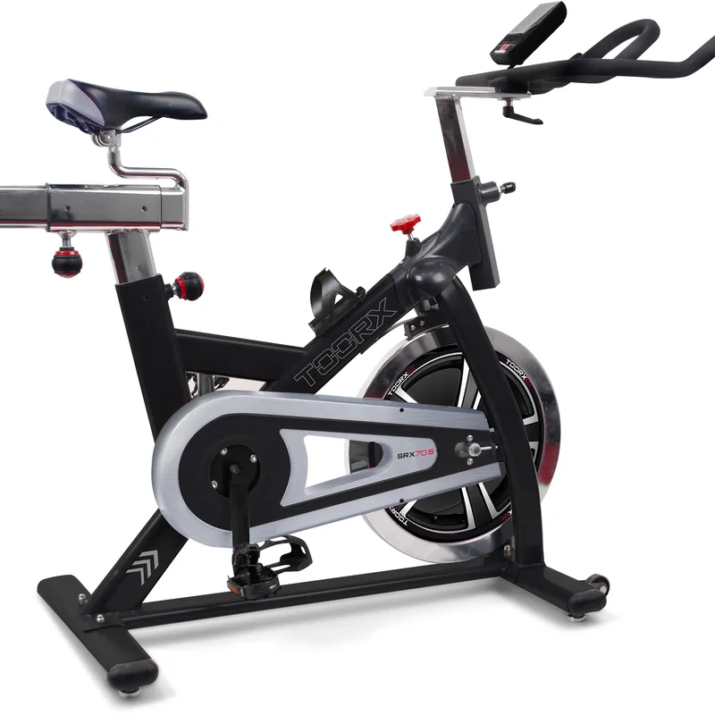 Сайкл-тренажер Toorx Indoor Cycle SRX 70S (SRX-70S) від італійського виробника Garlando S.p.A. призначений для інтенсивного кардіотренування в домашніх умовах. Тренажер має колодкову гальмівну систему з ручним безступінчатим регулюванням навантаження, а також сучасний комп'ютер із необхідним набором функцій. Важкий 22-кілограмовий маховик разом із ремінним приводом забезпечують безшумність роботи тренажера та достатнє навантаження навіть для підготовлених спортсменів. Спін байк розрахований на вагу до 125 кг і підійде для користувачів зростом до 2 м. Вбудований приймач для бездротового датчика вимірювання пульсу буде доречним під час тренування для контролю частоти серцевих скорочень. Спортивне сидіння та кермо регулюються по висоті та в горизонтальній площині, забезпечуючи індивідуальне налаштування. Транспортувальні ролики в передній частині тренажера дозволяють вільно переміщати його по кімнаті.