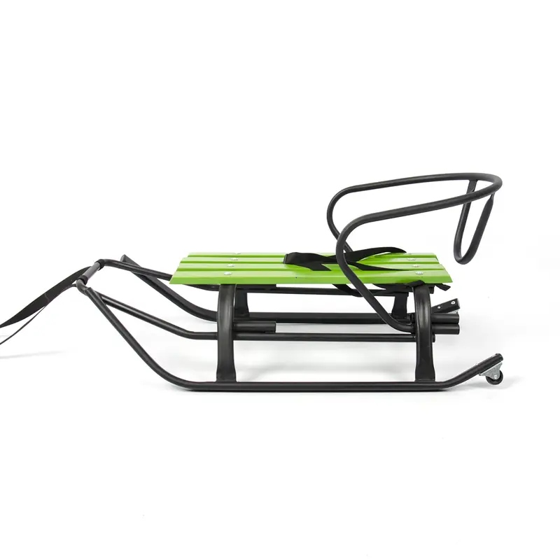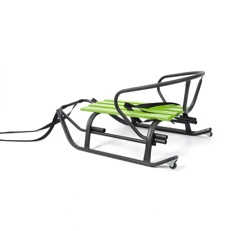 Санки "Комета" черные с колесиками + спинка + цветная планка