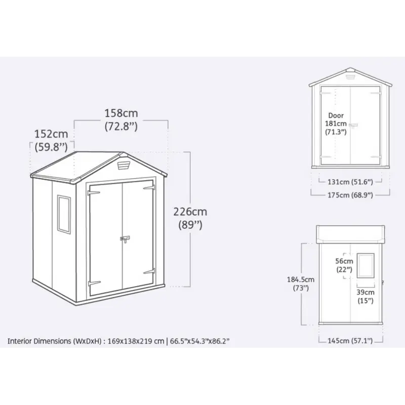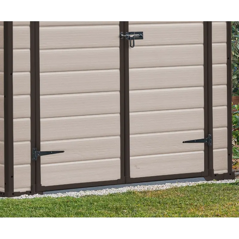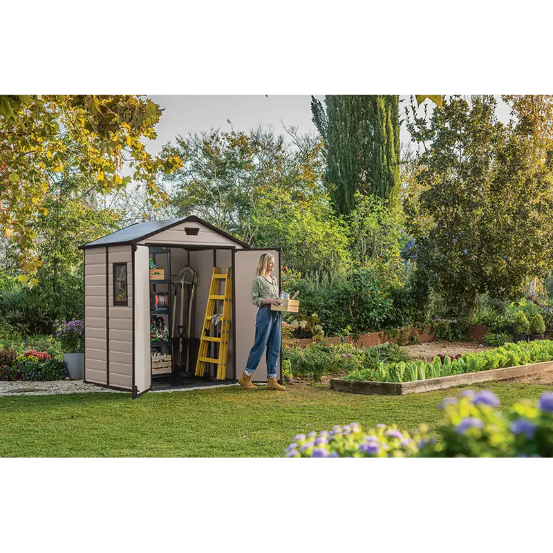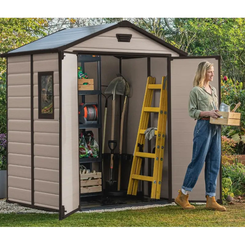 Пластиковий сарай Keter MANOR 6x5 — це зручне та довговічне рішення для зберігання садового інвентарю, інструментів або побутових речей. Завдяки імітації структури дерева він виглядає естетично та вписується у будь-який двір або сад. Модель має двосхилий дах, подвійні двері для зручного доступу, а також вбудовану вентиляцію для захисту вмісту від вологи. У конструкції використовується міцний пластик з армуванням сталевими елементами, що забезпечує високу стійкість до навантажень і впливу погодних умов. Простота складання, мінімальний догляд і довговічність — ключові переваги цієї моделі.Особенности Стіни виконані за технологією DUOTECH™, яка забезпечує двошарову міцну конструкцію з можливістю фарбування й монтажу полиць; Дах витримує навантаження до 75 кг/м² снігу, що робить сарай придатним до використання навіть у складних погодних умовах; Передбачена система природної вентиляції, яка зменшує ризик утворення конденсату всередині приміщення та забезпечує циркуляцію повітря; Широкі подвійні двері з отвором 131 см дозволяють комфортно заносити великогабаритні предмети або техніку; Високоякісний пластик не іржавіє, не гниє та не потребує регулярного догляду чи фарбування протягом усього терміну експлуатації.