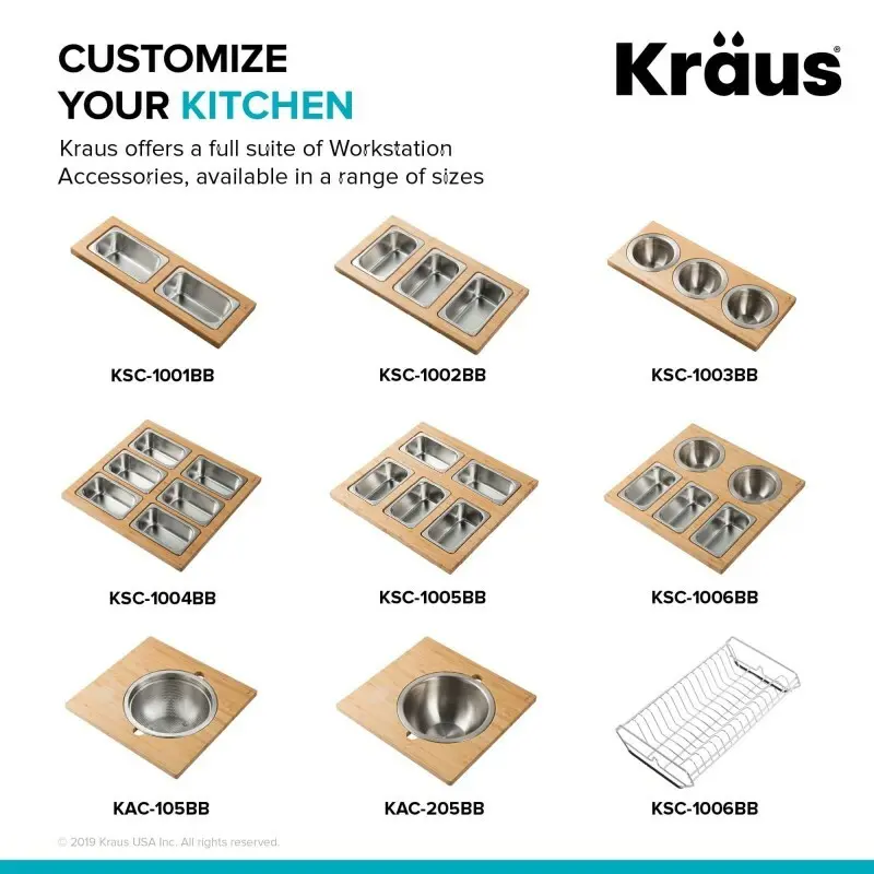 100% органічна і природно гігієнічна бамбукова сервірувальна дошка вміщує чаші з нержавіючої сталі, які ідеально підходять для приготування інгредієнтів для страв або роздачі закусок і приправ. Обтічний дизайн спрощує робочий процес на кухні, дозволяючи тримати інгредієнти під рукою, і забезпечує легкий перехід від приготування до сервіровки. Найкраще є те, що працюючи прямо над раковиною, ви позбудетеся безладу на стільниці і зможете вичищати сміття прямо в злив або в сміттєвий бак, тобто це легке прибирання. Миски для приготування їжі з нержавіючої сталі мають вкладені розміри для зручності штабелювання і зберігання, а також безпечні для їжі, бо не містять бісфенолета. Опануйте повний комплект аксесуарів KRAUS, щоб збільшіти вашу кухню і підняти її на абсолютно новий рівень!
