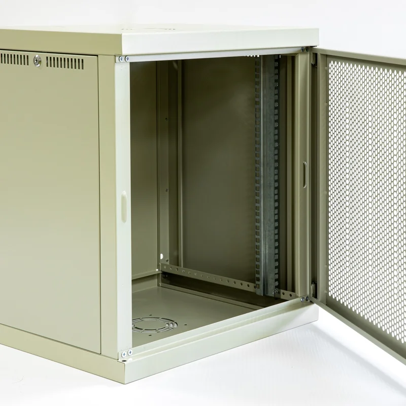 Зварні рами із сталі 1 мм. Складання шаф максимально спрощене завдяки заздалегідь запресованим кріпильним елементам. Для складання досить викрутки. 19" Монтажних рейок встановлюються з кроком 20 мм в круглі отвори. Немає проблеми з вирівнюванням вертикалі рейок, як в шафах з овальними кріпленнями. Передні двері встановлені на петлях-шпінгалетах. Двері не провисають і не бовтаються, шпінгалети вставлені в пластикові Втулки, що повністю прибирає люфт дверей. Полотно дверей посилене, немає відчуття м’якості і гнучкості дверей при відкриванні. У базовому варіанті є 2 місця під установку вентиляторів. Здатність навантаження до 120 кг Передні двері з перфорацією шестигранником.Площа відкритого простору 63%.