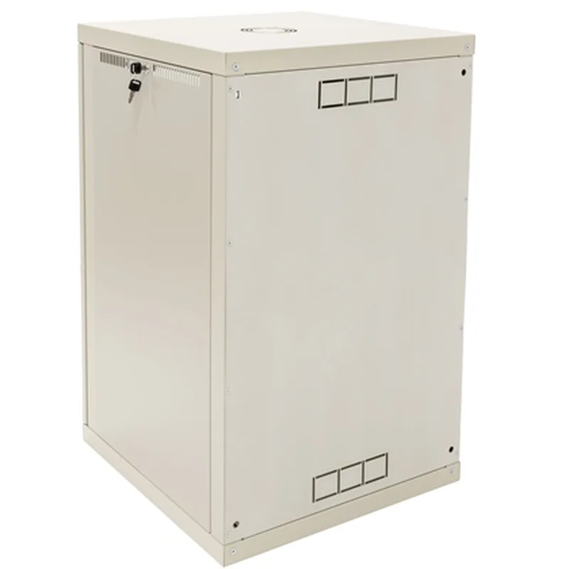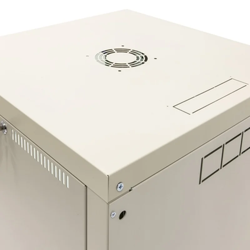 Шафа настінна, розбірна, зі знімними бічними стінками. У комплекті 2 пари рэков. Дверці з перфорованою сіткою. Можливість установки 120мм вентилятора. Введення кабелю ззаду, згори, знизу.Шафа кріпиться на стіну за допомогою анкерів або на монтажну планку. Збірка шаф максимально спрощена завдяки заздалегідь запресованим кріпильним елементам. Для складання досить викрутки.