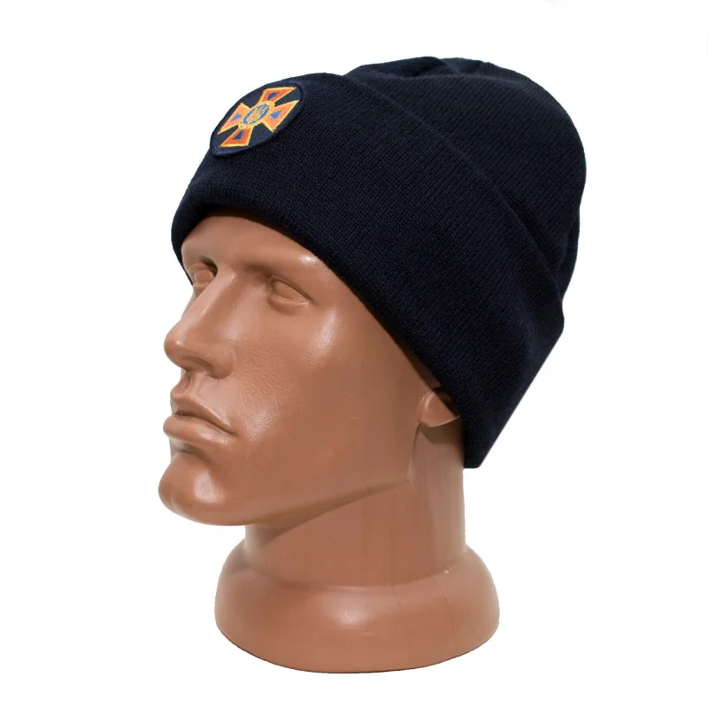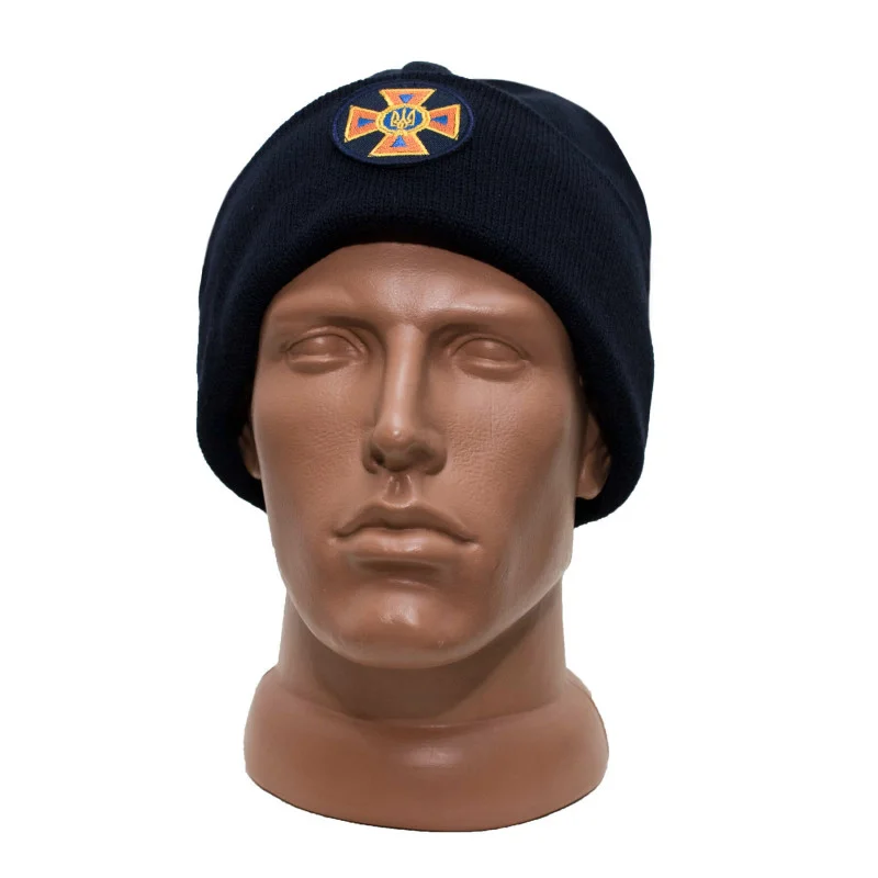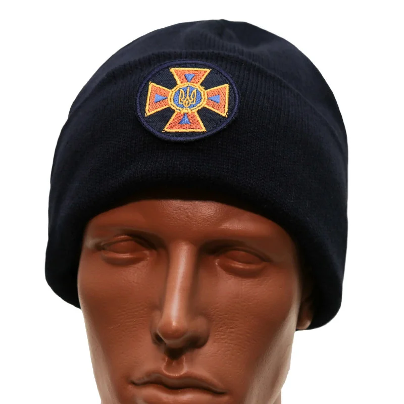 Шапка «ДСНС» в'язана на флісі з відворотом Темносиня