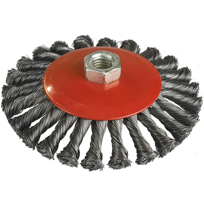 Щітка зачисна конусна з куфтованим дротом для виключно грубою обробки важкодоступних зон. Ідеальна для зачистки невеликих сталевих поверхонь, кромок та пазів на високих кутових швидкостях. Призначена для кутових шліфувальних машин з різьбою M14