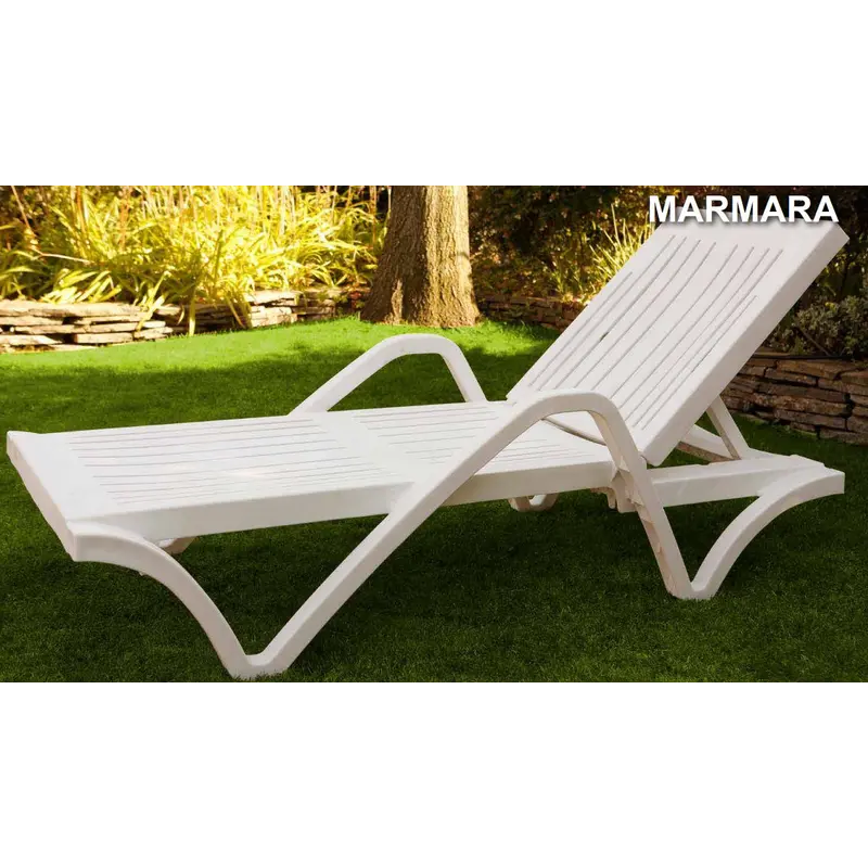 Шезлонг Kayalar Sunbed Marmara призначений для відпочинку на вулиці. Виконаний із міцного пластику. Підходить для установки в саду, на терасі, пляжі або біля басейну. Спинка регулюється за нахилом. Легко чиститься та не боїться вологи. Колір: білий.