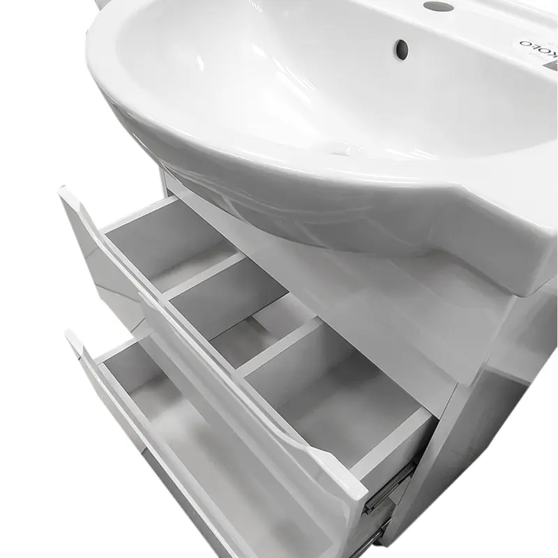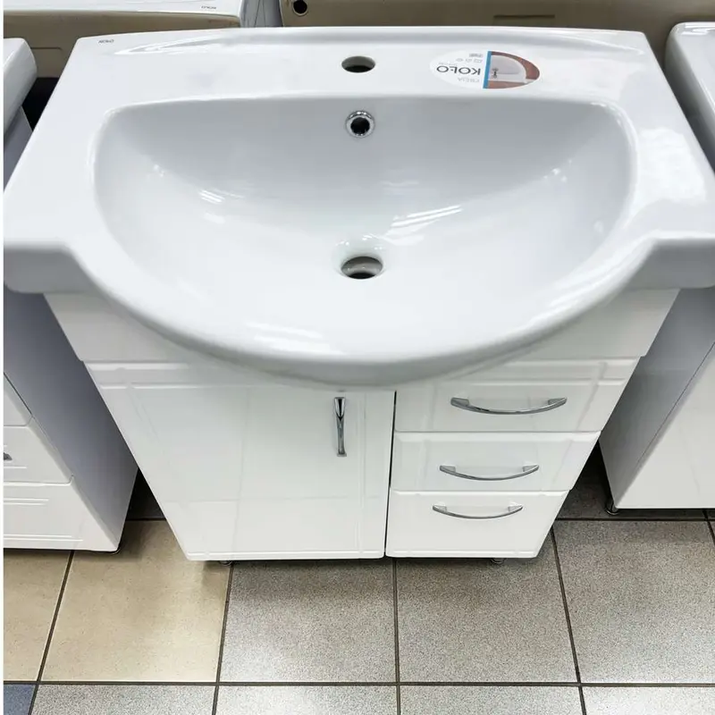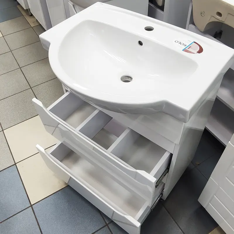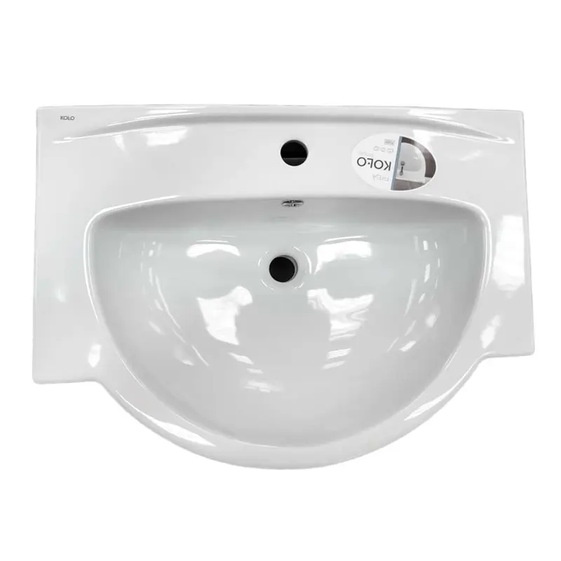 Подвесная полукруглая мебельная раковина Freja 65 от Kolo поставляется с отверстием для установки смесителя (можно купить отдельно) и с переливным отверстием. Сифон в комплект не входит.