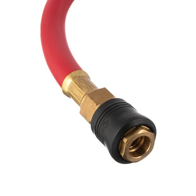 Шланг легко підключається до системи за допомогою швидкороз'ємних з'єднань європейського типу, вони герметичні та дозволяють швидко під’єднати пневмоінструмент до компресора. Виготовлені з'єднання з латуні, мають ряд переваг перед сталевими фітингами. Характеризуються кращою стійкістю до корозії, мають більший строк експлуатації, довговічніші.