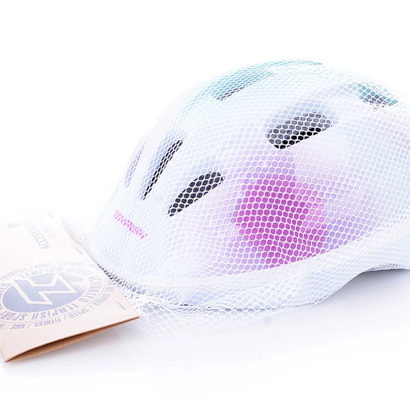 По периметру шлем оборудован вентиляционными отверстиями, чтобы голова ребенка находилась в хорошем климате и не перегревалась. На передней части, в отверстиях, присутствуют сетчатые вставки для защиты от попадания мусора и насекомых.