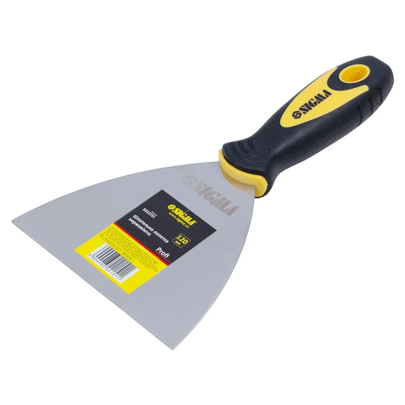 Шпательна лопатка нержавіюча Profi 120мм SIGMA (8322151) призначена для виконання штукатурно-оздоблювальних робіт: нанесення, вирівнювання, згладжування різноманітних будівельних розчинів на площині, а також для демонтажу шпалер, фарби і аналогічних матеріалів.