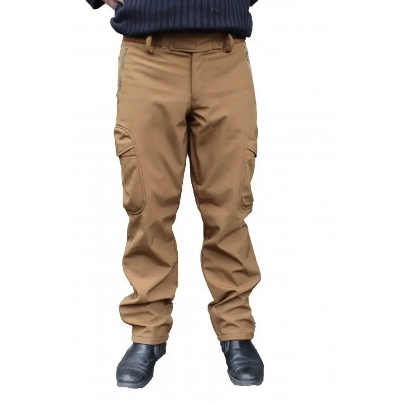 Мужские штаны СофтШелл хорошо хранят тепло и прилегают к телу. Модель приятного песочного цвета отлично смотрится на работе и при прогулках по городу, но ее свойства делают ее более полезной на природе. Для распределения мелких предметов есть два накладных кармана и четыре на молнии (боковые и задние).