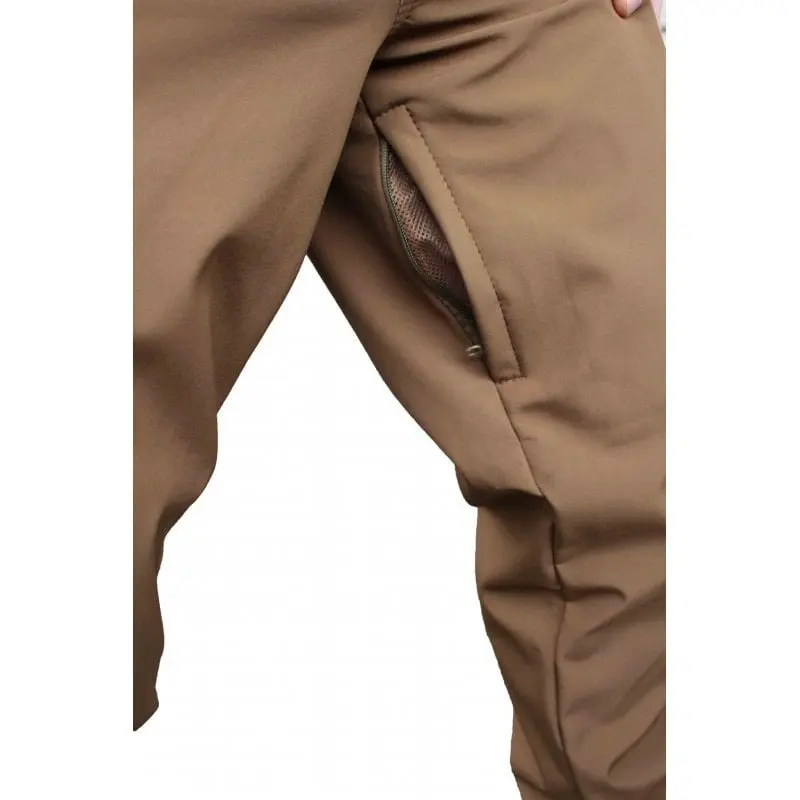Мужские штаны СофтШелл хорошо хранят тепло и прилегают к телу. Модель приятного песочного цвета отлично смотрится на работе и при прогулках по городу, но ее свойства делают ее более полезной на природе. Для распределения мелких предметов есть два накладных кармана и четыре на молнии (боковые и задние).