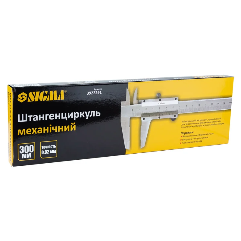 Штангенциркуль механічний 300мм точність ±0.02мм (пенал) SIGMA (3922291) для проведення зовнішніх і внутрішніх вимірювань. Оснащений глибиноміром, має ціну ділення від 0.02мм.