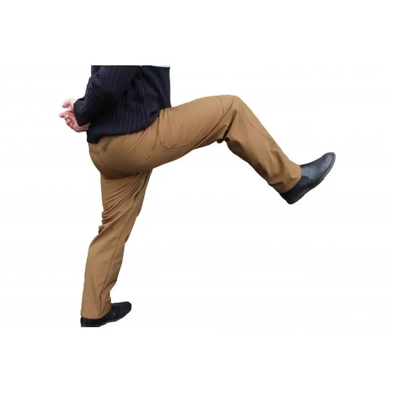 Мужские штаны СофтШелл хорошо хранят тепло и прилегают к телу. Модель приятного песочного цвета отлично смотрится на работе и при прогулках по городу, но ее свойства делают ее более полезной на природе. Для распределения мелких предметов есть два накладных кармана и четыре на молнии (боковые и задние).
