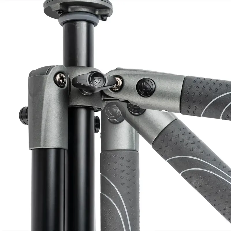 Ніжки штатива з алюмінієвого сплаву Alu 6063-T5 регулюються під кутом 20 °, 45 ° і 80 ° градусів завдяки кнопкам-фіксаторам. Важливо, що фіксуюча кнопка тепер розташовується саме там, де знаходиться великий палець під час установки кута ніжок. Модель має скошені протиковзкі наконечники опор, які можна замінити на шипи, що поставляються в комплекті, і, таким чином, отримати відмінне зчеплення на будь-яких поверхнях. Зверніть увагу, що перед встановленням шипів необхідно встановити шайби, що йдуть в комплекті. Секції ніжок фіксуються ексцентриковим затискачем Quick-flip, що дозволяє швидко і легко розкладати або складати штатив і регулювати висоту в міру необхідності. Це дає можливість швидко досягти необхідної довжини кожної з ніжок, щоб підлаштуватись до будь-якого рельєфу.