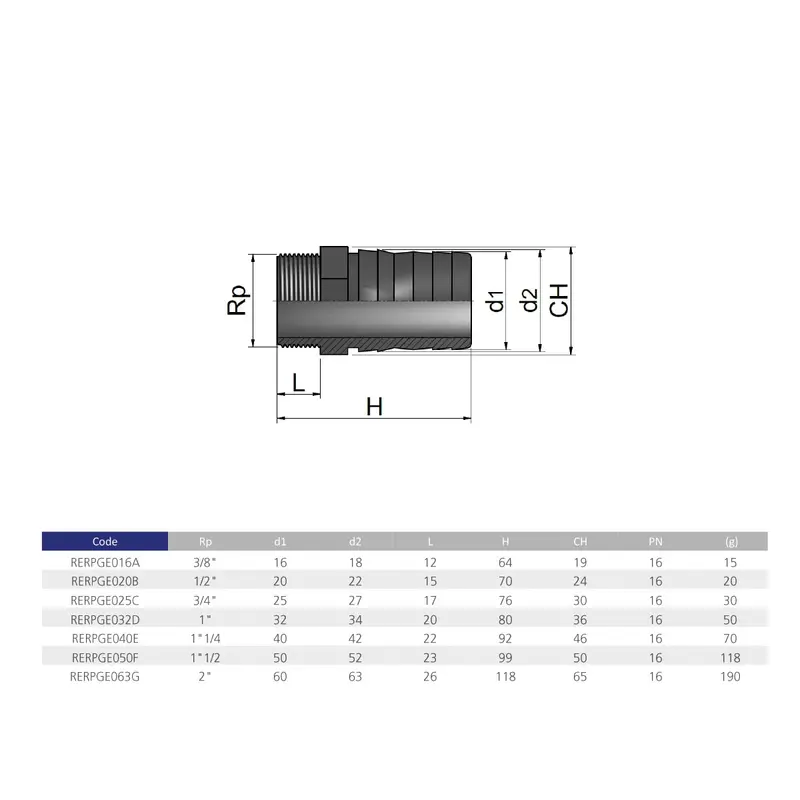 Різьбовий штуцер для шланга Effect RERPGE з непластифікованого полівінілхлориду PVC-U. Виробництво Італія. Вироби з ПВХ підходять для перекачування рідин з максимальною температурою до 60°C. При збільшенні температури рідини граничний тиск знижується.Ціна вказана за одну одиницю.