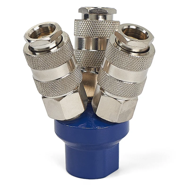 Швидкознімне з'єднання трійник це трипозиційний розподільник для швидкознімних сполучень, що призначений для підключення декількох приладів до одного джерела тиску. Корпус виготовлений з високоякісного металу, що забезпечує довговічність та захист від корозії. Розподільник оснащений трьома швидкознімними роз'ємами, що дозволяють швидко підключати та відключати шланги, зменшуючи час обслуговування. Це ідеальне рішення для майстерень або промислових підприємств, де необхідне швидке та надійне підключення декількох інструментів до одного компресора. Різьба внутрішня 1/4".