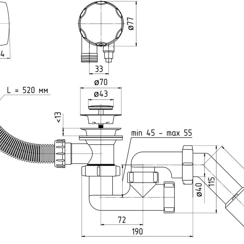 Сифон АНИ-ПЛАСТ с переливом полуавтомат 520 мм регулируемый (ЕМ421)