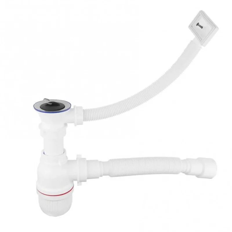 Сифон для мойки Bakimay PL1033 с переливом позволяет избежать затопления кухни, если забилась раковина. Его гибкие элементы дают возможность устанавливать устройство на раковины с разными габаритами. В то же время прибор надежен и долговечен. Специальный резервуар в нижней части осаждает крупные частицы, препятствуя засорению канализационных труб. В то же время его можно поворачивать по окружности во все стороны.