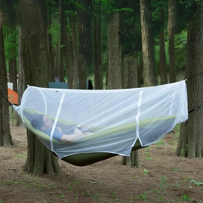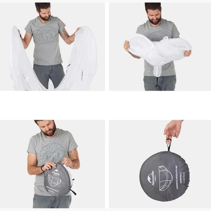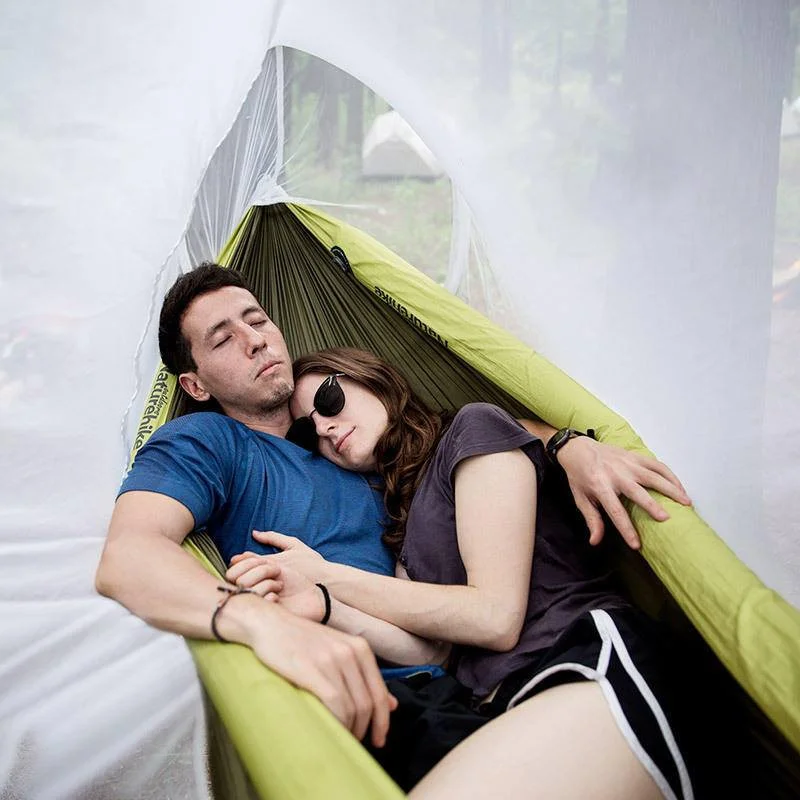 Щоб відпочинок був комфортним, а сон — максимально міцним, туристичний гамак рекомендується використовувати разом із москітною сіткою NH18D003-C від Naturehike. Цей аксесуар виготовлений із надлегкого та дихаючого синтетичного матеріалу, що захищає відпочиваючого від надокучливих комах.