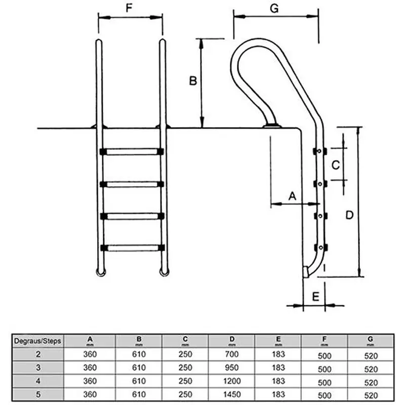 Сходи Golfinho E5086.3 – це ідеальний варіант для повністю заглиблених басейнів. Сходи виготовлені з труби діаметром 43 мм. Оснащені сходинками з протиковзними пластиковими накладками. Завдяки гумовим заглушкам, елементи кріплення не порушують гідроізоляцію чаші басейну. Виконані з нержавіючої сталі марки AISI 316, стійкої до корозії, впливу ультрафіолету та хімічних реагентів. Кріпильні елементи постачаються в комплекті.