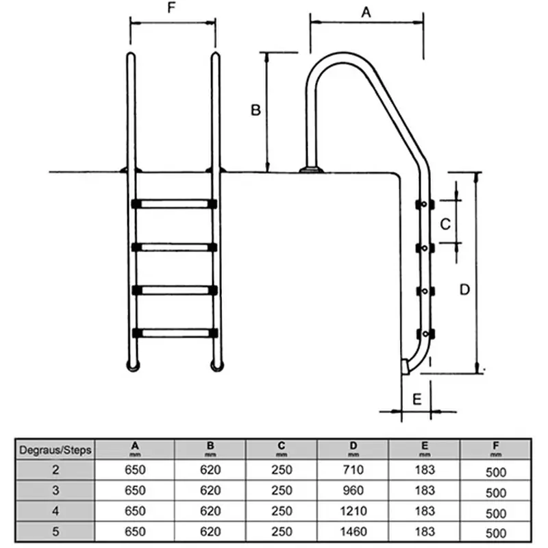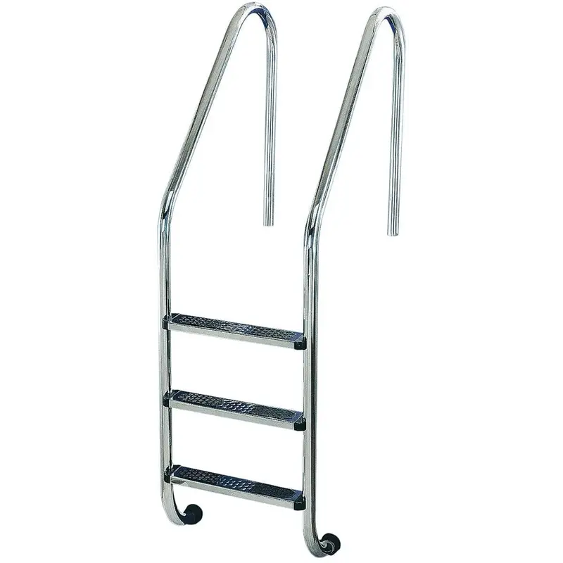 Сходи Golfinho E518.3 – це ідеальний варіант для повністю заглиблених басейнів. Сходи виготовлені з труби діаметром 43 мм. Оснащені сходинками з протиковзними пластиковими накладками. Завдяки гумовим заглушкам, елементи кріплення не порушують гідроізоляцію чаші басейну. Виконані з нержавіючої сталі марки AISI 316, стійкої до корозії, впливу ультрафіолету та хімічних реагентів. Кріпильні елементи постачаються в комплекті.