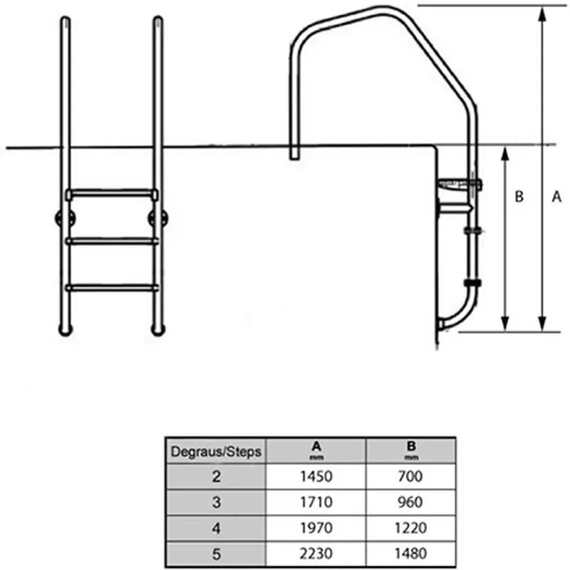 Сходи Golfinho E5265.3 – це ідеальний варіант для повністю заглиблених басейнів. Сходи виготовлені з труби діаметром 43 мм. Оснащені сходинками з протиковзними пластиковими накладками. Завдяки гумовим заглушкам, елементи кріплення не порушують гідроізоляцію чаші басейну. Виконані з нержавіючої сталі марки AISI 316, стійкої до корозії, впливу ультрафіолету та хімічних реагентів. Кріпильні елементи постачаються в комплекті.