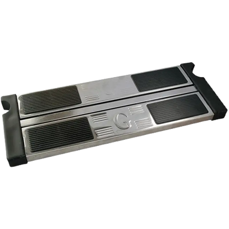 Подвійна сходинка для сходів Golfinho. Виконана з нержавіючої сталі AISI 316, стійкої до корозії, впливу ультрафіолету та хімічних реагентів. Має пластикові накладки з протиковзним ефектом.