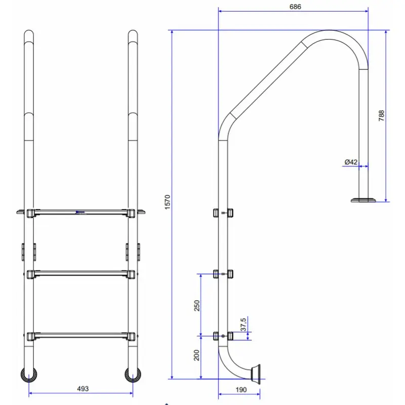 Сходи Emaux NSL515-SR призначені для зручного і безпечного спуску в басейн. Поручні та сходи виготовлені з полірованої нержавіючої сталі марки AISI 316. Поручні кріпляться до борту за допомогою пластикових стаканів (анкерів). Нижня частина сходів упирається в стіну басейну прогумованою заглушкою. Сходинки кріпляться до поручнів за допомогою болтів. Сходи призначені для заглиблених басейнів. У комплекті поставляються кріпильні елементи. Стандартний тип сходів.