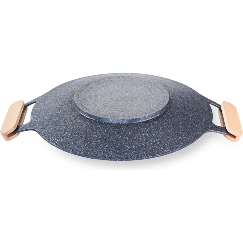 Для зручності використання сковорода-садж оснащена парою ручок зі вставками із натурального бука. Це доповнення не тільки є естетично привабливим елементом дизайну, але також захищає руки від опіків. До комплекту додатково входить сталеве кільце розміром 18.2 х 1.3 сантиметрів. Цей аксесуар встановлюється поверх газового пальника і служить опорою для сковороди, запобігаючи її зісковзуванню з конструкції під час приготування.