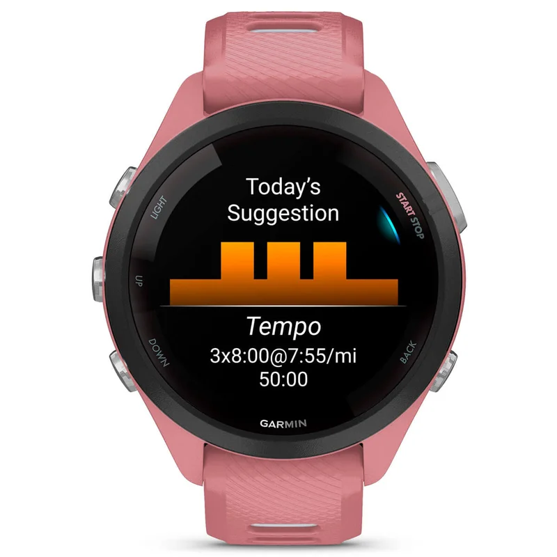 Forerunner 265 Щоб дозволити спортсменам досягати якнайкращих результатів, швидше та ефективніше проходити змагання, годинники Forerunner 265 обладнані інструментами моніторингу продуктивності від Garmin Firstbeat Analytics, серед яких VO2 max, стан продуктивності, тренувальний ефект та багато інших. Для підготовки до наступного забігу пристрої пропонують скористатись одним з двох варіантів адаптивних тренувальних планів на вибір: ввести інформацію про перегони у календар Garmin Connect, щоб отримати щоденні запропоновані тренування, або ж дотримуватись безкоштовних планів Garmin Coach від досвідчених тренерів з бігу. Тренуючись на відкритому повітрі, атлети можуть планувати свою стратегію на день змагань за допомогою програми-вказівника PacePro, яка адаптується відповідно до темпу та особливостей обраних трас. Впевнено долайте дистанцію з новим годинником Forerunner 265, адже технологія SatIQ і багатодіапазонний GPS забезпечать виняткову точність позиціювання у найскладнішому середовищі. Для цілодобового відстеження самопочуття годинники Forerunner 265 укомплектовані цілим комплексом датчиків та функцій контролю здоров’я. Це і датчик Pulse Ox, що вимірює ступінь насичення крові киснем, і моніторинг енергії Body Battery, і розширений моніторинг сну з оцінкою сну, і відстеження стресу, менструального циклу, вагітності й багато-багато інших. Функції розумного годинника дозволяють отримувати сповіщення зі смартфона на своє зап’ястя, завантажувати пісні з сервісів Spotify, Deezer або Amazon Music (з преміумпідпискою) та зручно оплачувати покупки за допомогою безконтактних платежів Garmin Pay. Для більшої безпеки на пробіжках пристрої обладнані функціями «Виявлення інцидентів», «Допомога» та LiveTrack. Дисплей. У смарт-годиннику Forerunner 265S статистика та інформація відображається на яскравому AMOLED-дисплеї. Приготуйтеся бути ще краще! Ранковий звіт стану. Будь завжди підготовленим до наступного марафону. Автономність. До 15 днів автономної роботи в режимі смарт-годинника. Для будь-якого зап'ястя. Модель випускається у двох розмірах. Індивідуальний підхід до тренувань. З біговим віджетом, персоналізованими щоденними тренуваннями та оцінкою готовності ви зможете розробити індивідуальний підхід до ваших тренувань. Ваш особистий тренер. Слідкуйте за своїми результатами, вибирайте потрібні режими тренувань. Forerunner 265S - це ваш особистий мотиватор та тренер. Ранковий звіт. Відразу ж після пробудження отримуйте звіт про свій сон і готовність до тренування, а також інформацію про стан серцевого ритму та погоду. Біговий віджет. Підготуйтеся до наступного забігу або марафону, за допомогою вбудованих порад, персоналізованих щоденних тренувань, що базуються на деталях траси, погоді. Щоденні рекомендовані тренування. Отримайте тренування саме для вас. Вони адаптуються після кожного тренування, щоб відповідати вашій продуктивності та відновленню, а також враховують майбутні марафони в календарі вашої програми Garmin Connect. Готовність до тренувань. Після пробудження ви отримаєте оцінку готовності, засновану на якості вашого сну, відновленні, тренувальному навантаженні та багато іншого. Відстеження ефективності тренувань. Завдяки моніторингу статусу ВСР, нещодавнім історіям тренувань та продуктивності, ви зможете легко зрозуміти, чи ефективно ви тренуєтеся. Досягайте піку своїх можливостей! Статус ВСР. Отримайт
