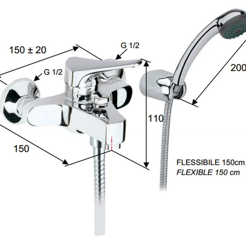 Смеситель, гибкий шланг 1500 мм, ручной душ, держатель для душа в комплекте.