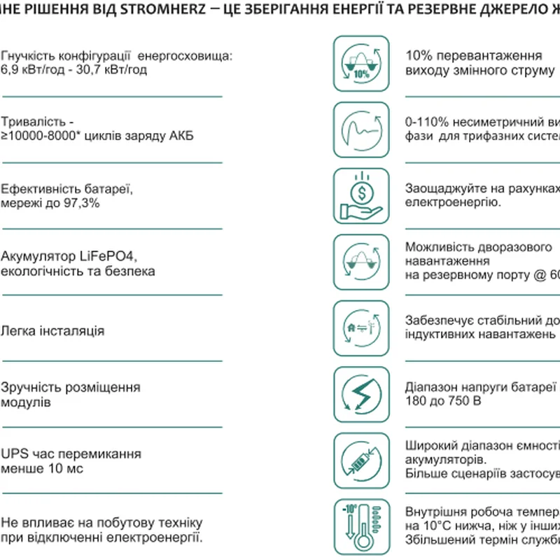 Stromherz – компанія є одним із небагатьох виробників, які інвестують у фундаментальні дослідження пристроїв на сонячних батареях. Виробник пристроїв TM Stromherz, заснований у 1993 році командою досвідчених інженерів-фахівців у Вельсі, Австрія, спеціалізується на фундаментальних дослідженнях технології акумуляторів LFP (літій-залізо-фосфат) та на розробці ESS (систем зберігання енергії). Акумулятори LFP (літій-залізо-фосфатні акумулятори) відомі терміном служби понад 10 000 циклів при глибині розряду 90% та гарантією якості 10 років.Гібридні інвертори від провідного австрійського виробника Stromherz це інтелектуальні гібридні системи збереження енергії, які перетворюють енергію сонця в акумулятори на цілодобовий ресурс, одночасно пропонуючи резервне живлення у разі збою в електромережі. Stromherz зберігає, знижує витрати на енергію , покращує стійкість мережі. Акумулятори та інвертори є найкращою пропозицією на ринку за співвідношенням ціна-якість.Офіційний сайт виробника Stromherz.Сонячна гібридна станція Stromherz S-10K-3Р-ESS-UA (GEN3) ідеально підійде для приватного будинку, таунхаусу або для великої квартири. Станцію можна налаштувати таким чином, щоб максимально економити на рахунках: система може накопичувати енергію в акумулятори в час, коли тариф найнижчий, а віддавати навпаки — коли тариф найдорожчий. Комплектація: Інвертор гібрідний Stromherz S-10K-3Р-ESS-UA (GEN3) BMS Stromherz SM-900V-2,3kWh/LCD (GEN3); АКБ Stromherz S-24LiFePo4 (GEN3)* 3 шт, загальна ємність АКБ 6,9 кВт, з можливістю розширення Характеристики Інвертора: