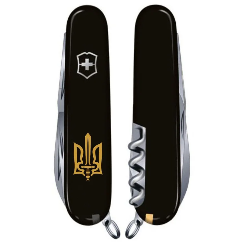 Патріотичний дизайн складного ножа SPARTAN UKRAINE на 12 функцій. Середній розмір популярного "швейцарця". Чорні накладки з емблемою Організації Українських Націоналістів. Саме чорні накладки були автентичними для перших складних ножів Victorinox. Легендарна швейцарська якість і непереможний український дух.