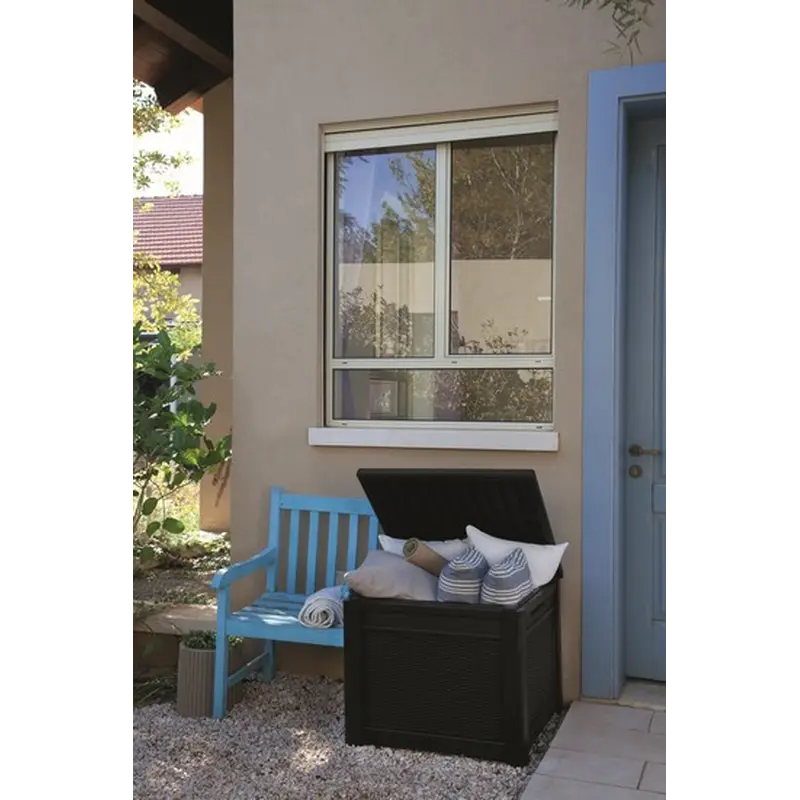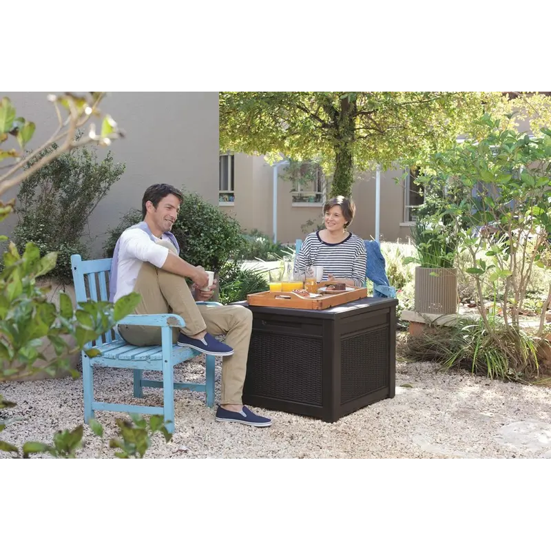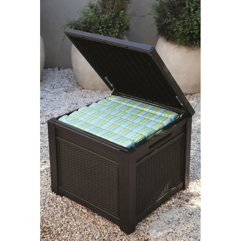 Садова скриня CUBE RATTAN 208л - це універсальне і дизайнерське рішення для оформлення. Скриня може бути не тільки місцем для зберігання підручних садових інструментів, але і класичним садовим столиком або стільцем. Простий дизайн, натхненний ротанговим плетінням, підкреслить характер оточення. Продукт виготовлений з високоякісного пластику, стійкого до дії несприятливих атмосферних явищ. Дуже просто і швидко збирається. Прекрасно підійде також для інтер'єрів приміщень.