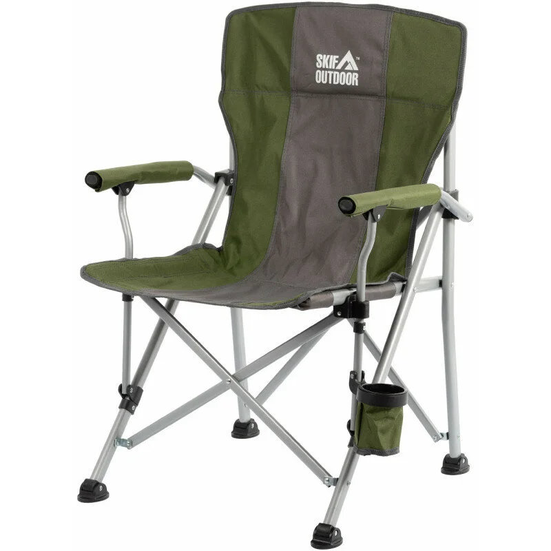 Корпус туристичного стільця Skif Outdoor Council виконаний з міцних, сталевих труб. Несучі труби діаметром 29 мм і рухливі лапки забезпечать кращу стійкість на пухкої поверхні. Сидушка, спинка, підлокітники і інтегрована підставка під напої пошиті з щільної, стійкої до пошкоджень і забруднень, тканини Oxford. Також тканина має водовідштовхувальний ефект. Для більшого комфорту підлокітники оснащені прошарком з пористої гуми. Максимальна вага, який витримує стілець - 120 кг.Вся конструкція легко складається і поміщається в щільний чохол.