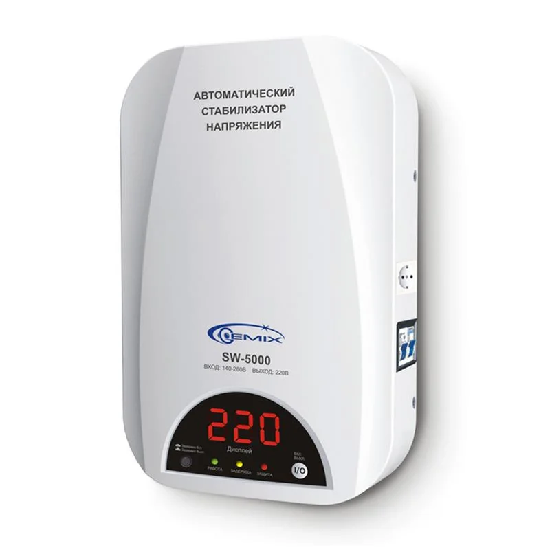Gemix SW-5000 - стабілізатор з мікропроцесорним управлінням, забезпечує ефективний захист від перевантаження, короткого замикання і імпульсних перешкод. Підходить для використання в мережах з високою динамікою зміни напруги мережі.Призначений для захисту ряду побутової техніки, окремо взятих потужних пристроїв, невеликого дачного будиночка від підвищеного / зниженого напруги і короткого замикання в мережі електроживлення.Надійний релейний стабілізатор в металевому корпусі має настінне виконання. Індикація здійснюється за допомогою цифрового дисплея.особливості:настінне кріпленнянадтонкийнормалізує напругаЗахищає від стрибків напругиЗалізний корпусНадійні силові елементиШвидке реагування на зміну напругицифровий дисплейПрацює з усіма видами побутової техніки, AV і комп"ютерної технікиФункція затримки включення навантаженняФункція регулювання меж автоматичного відключенняЗахист від високої напруги, низької напруги, захист від замикання і високої температури