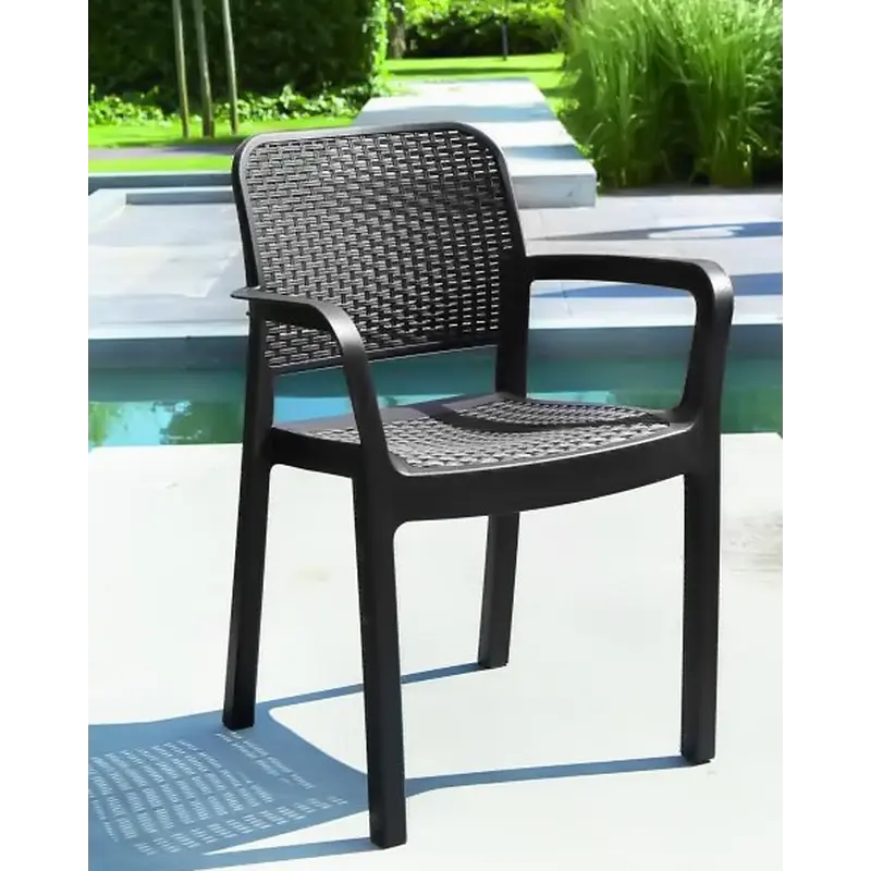 Стілець Samanna - це поєднання міцної конструкції і класичної елегантності. Зручний стілець, комфортна спинка виконана з фактурою ротанга плетіння, надійні підлокітники забезпечують оптимальний комфорт під час сидіння. Виріб характеризується міцністю і стійкістю до пошкоджень, тривалого впливу погодних умов, УФ-променів.