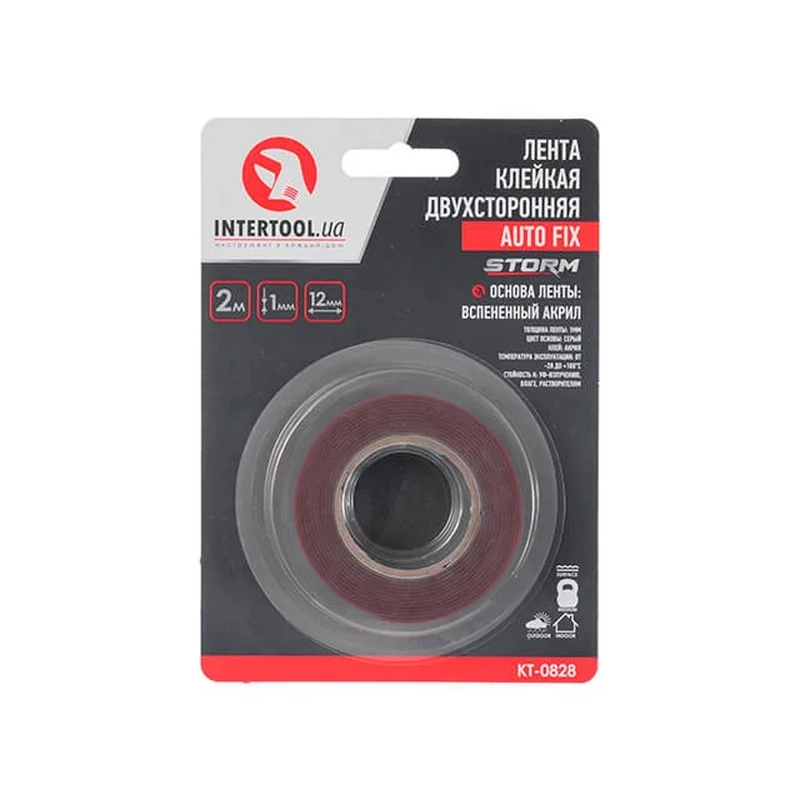Стрічка клейка двостороння AUTO FIX, 12 мм * 2 м * 1 мм, сіра, спінений акрил, STORM INTERTOOL KT-0828